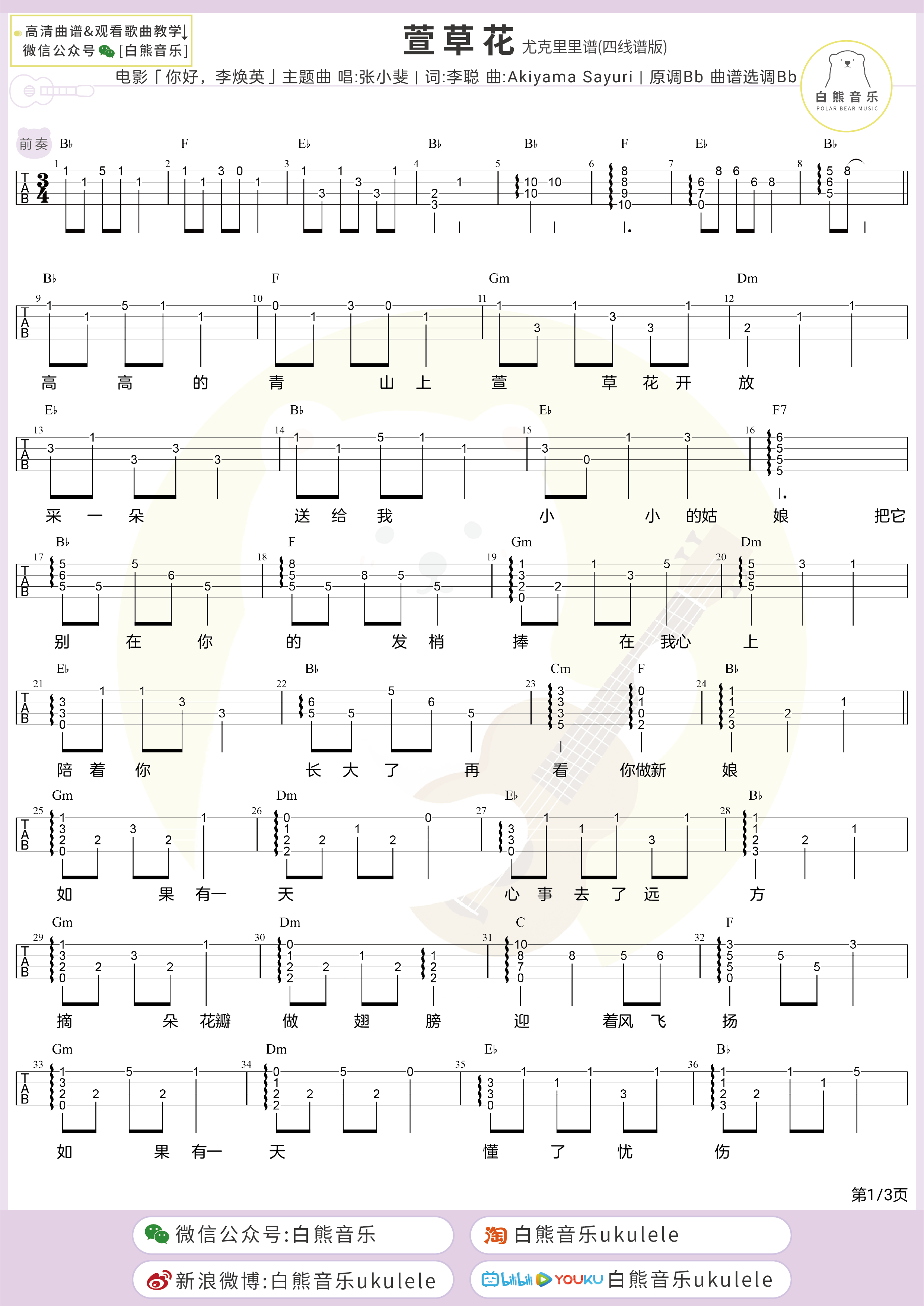 《萱草花》尤克里里谱_四线谱_ukulele弹唱...