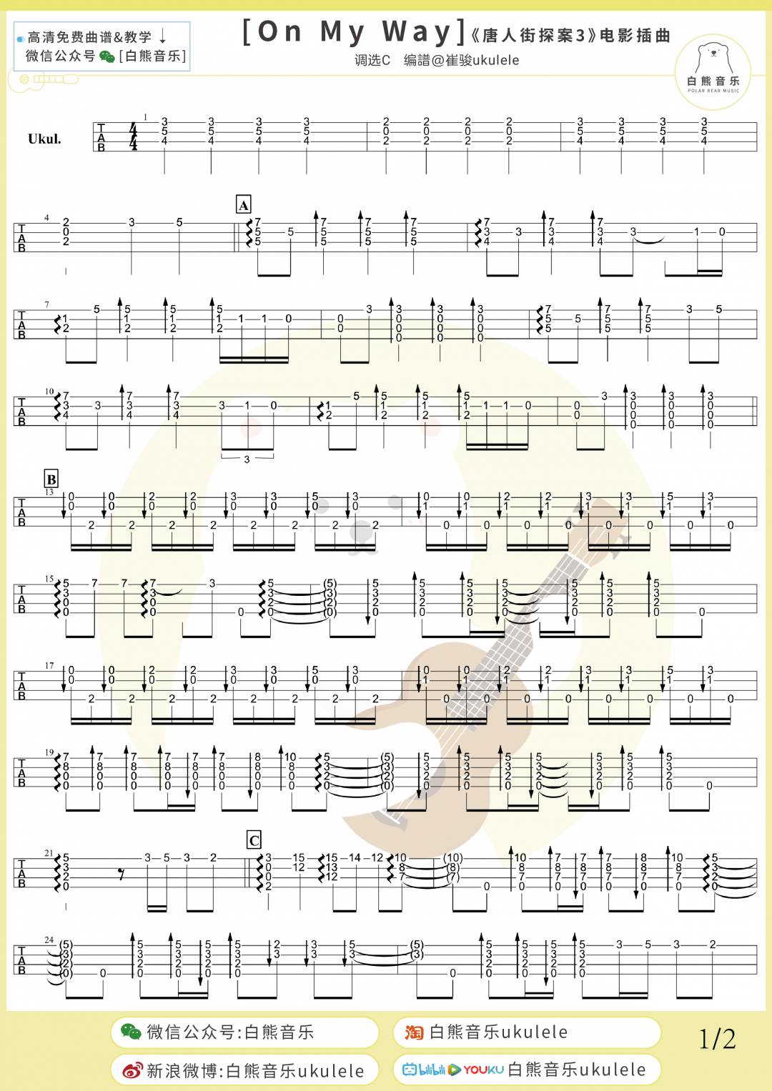 《OnMyWay》尤克里里谱_指弹版四线谱...