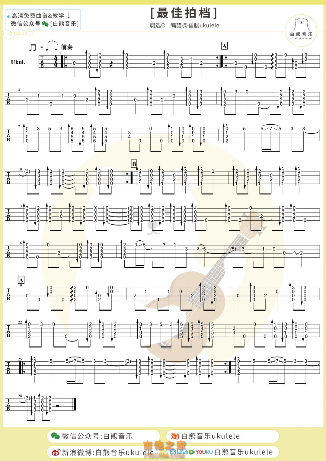 尤克里里许冠杰《最佳拍档》尤克里里指弹谱 白熊音乐