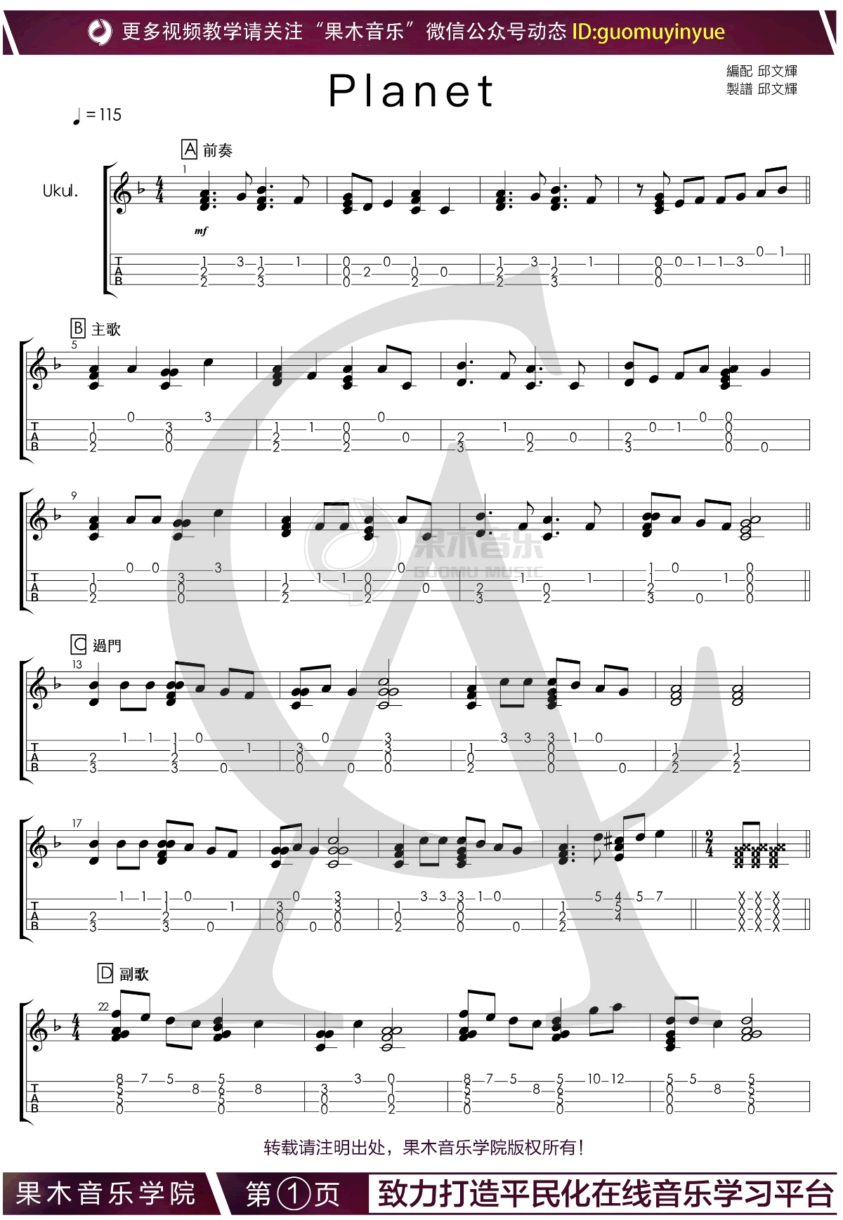 尤克里里Planet尤克里里谱 Planet ukulele指弹谱