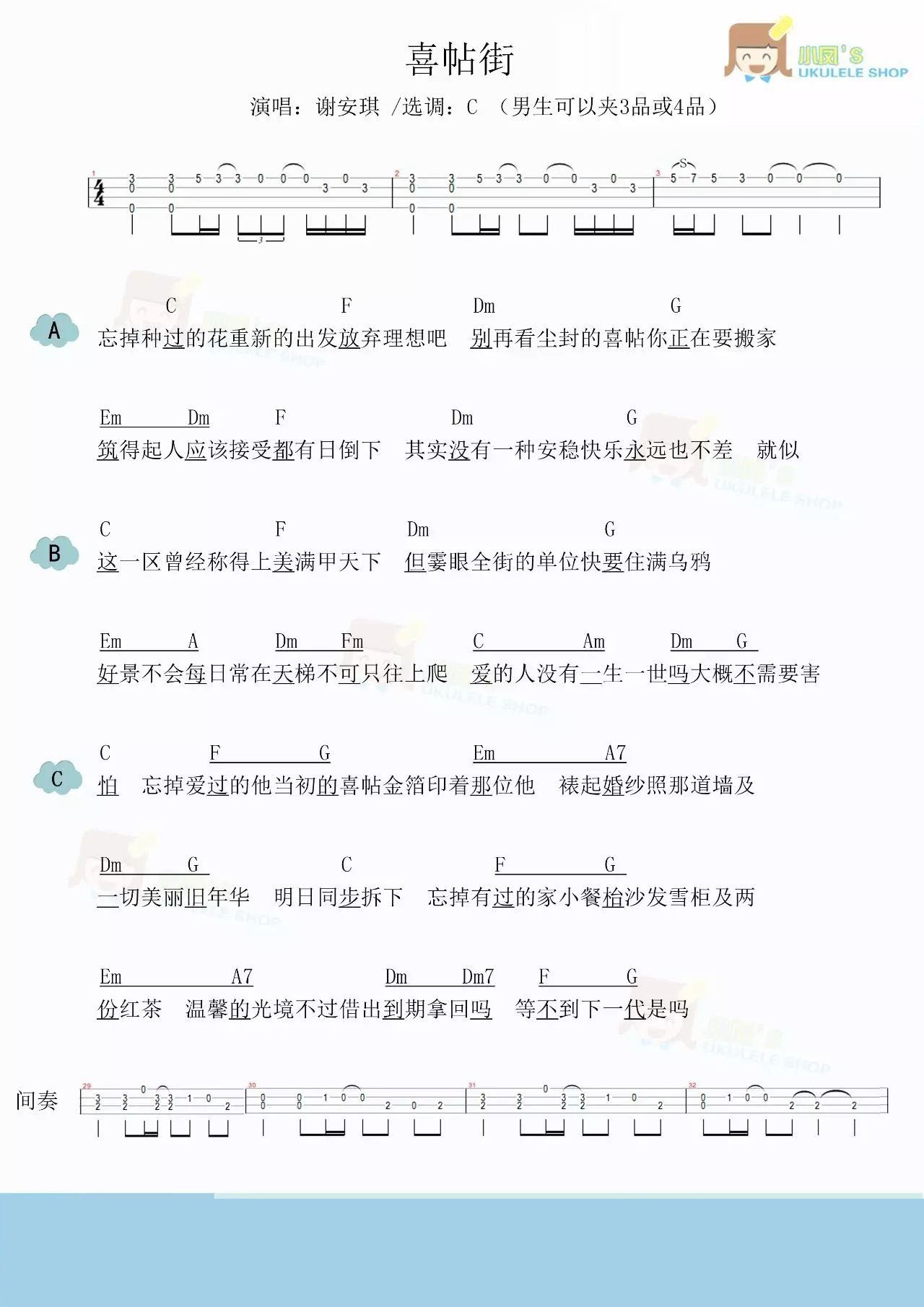 尤克里里谢安琪《喜帖街》尤克里里弹唱谱