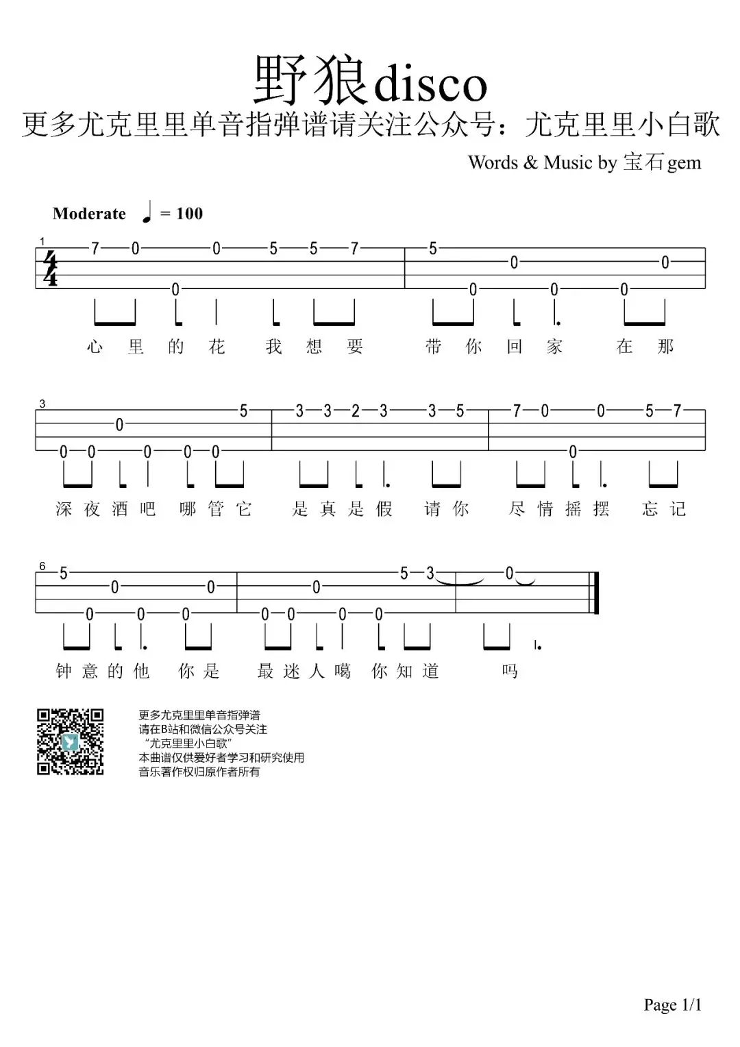 尤克里里新手单音《野狼disco》尤克里里指弹谱