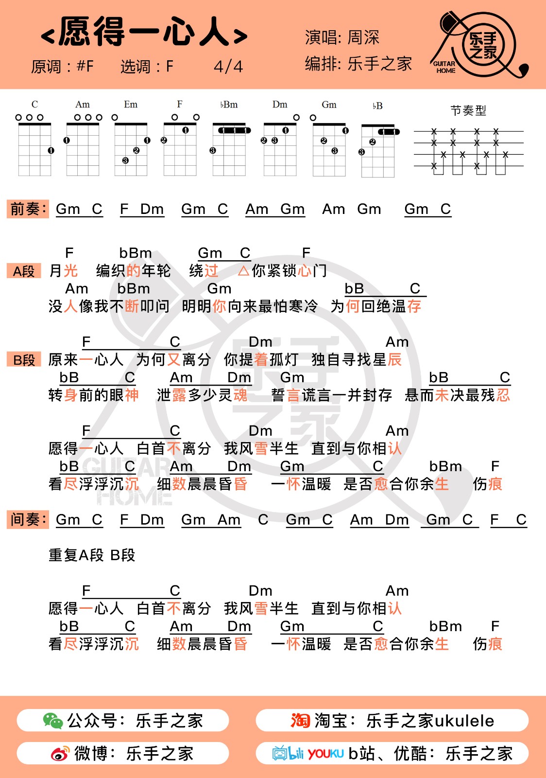 周深《愿得一心人》尤克里里弹唱谱...