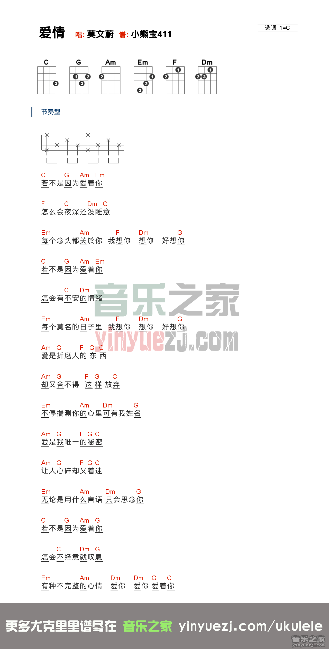 尤克里里C调 莫文蔚《爱情》尤克里里弹唱谱