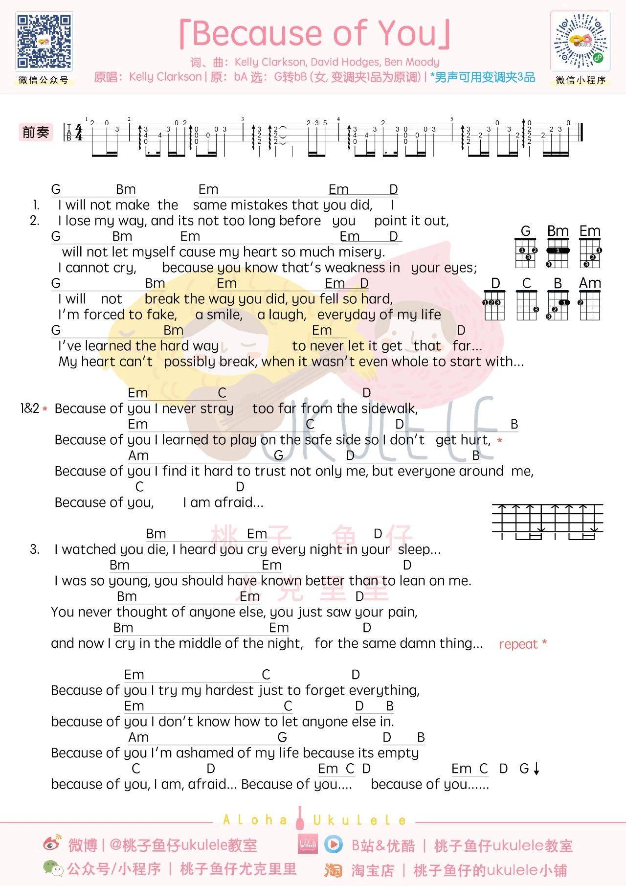 KellyClarkson《BecauseofYou》尤克里里谱_女生调ukulele谱...