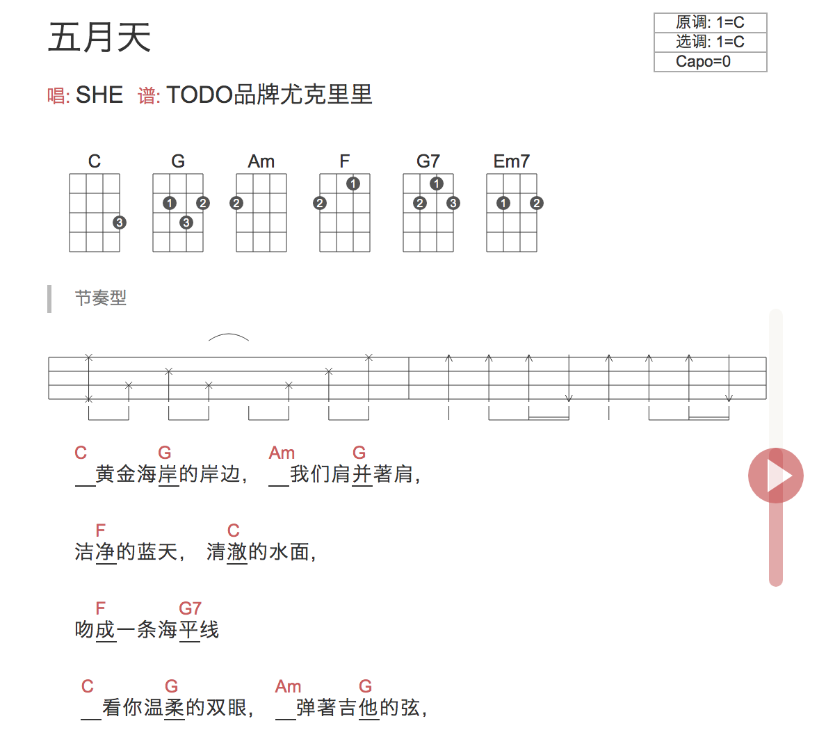 尤克里里SHE《五月天》尤克里里谱_C调弹唱曲谱