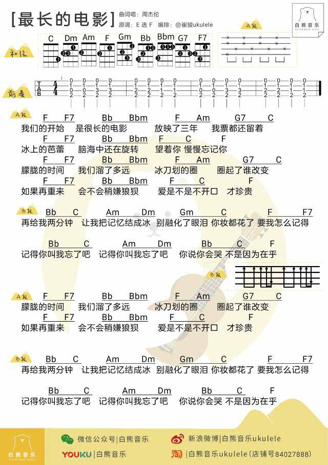 周杰伦《最长的电影》尤克里里谱_指弹+弹唱...