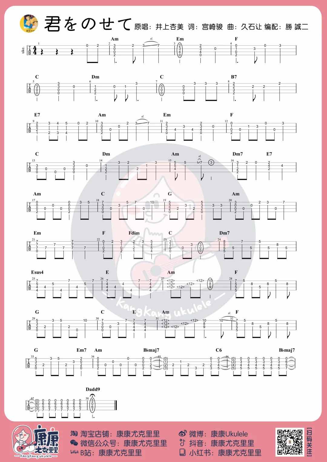 尤克里里天空之城主题曲《君をのせこ》尤克里里指弹谱子