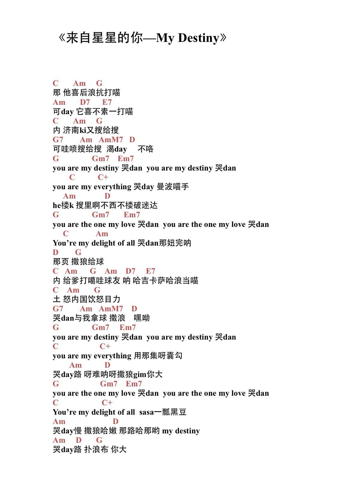 《MyDestiny-来自星星的你》尤克里里-C调弹唱谱...