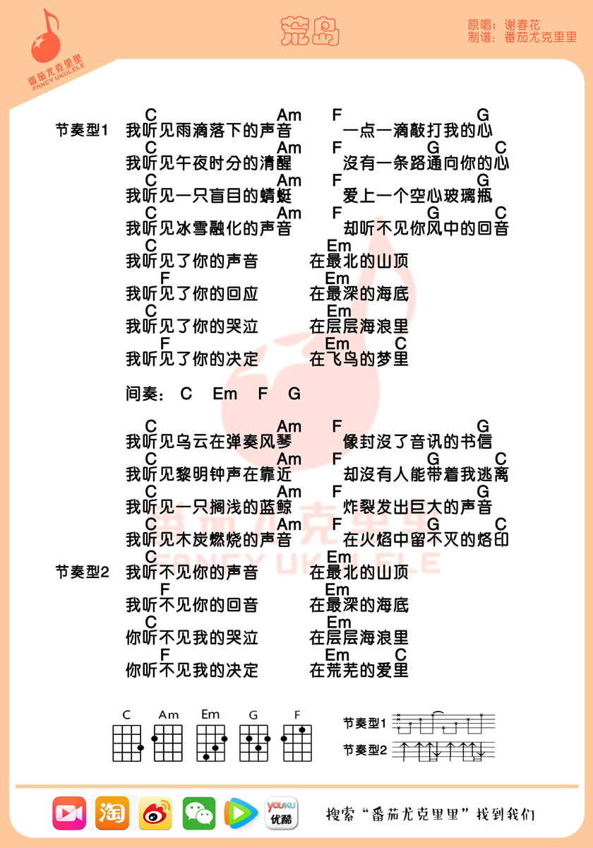 尤克里里谢春花《荒岛》尤克里里谱-C调弹唱谱