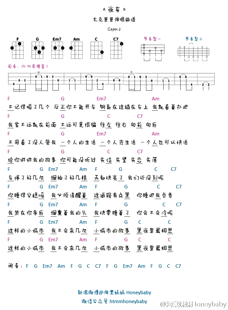曾轶可《夜车》尤克里里谱-D调弹唱谱...