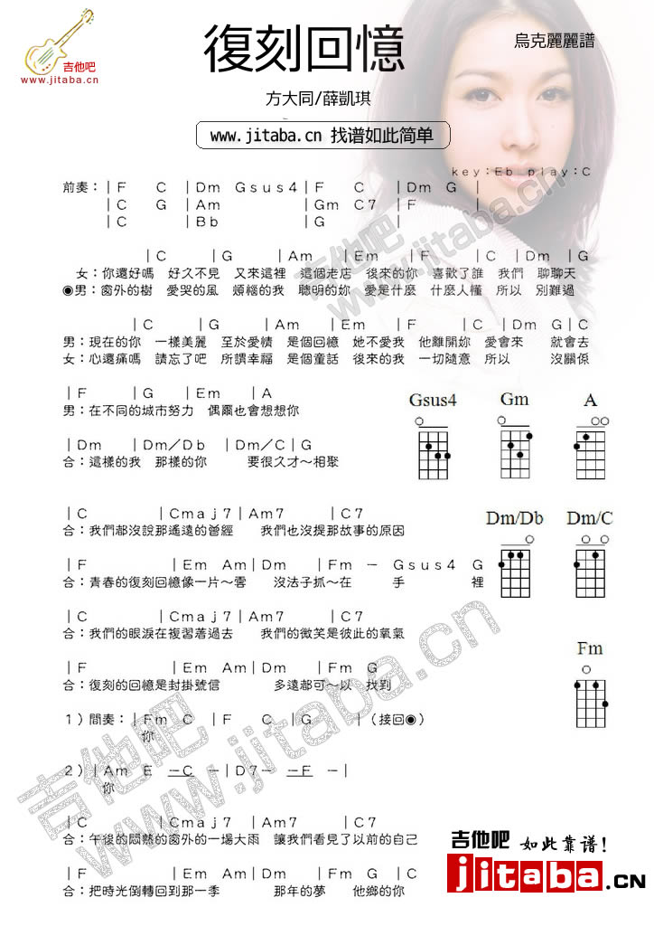 方大同/薛凯琪《复刻回忆》尤克里里谱_C调弹唱谱...
