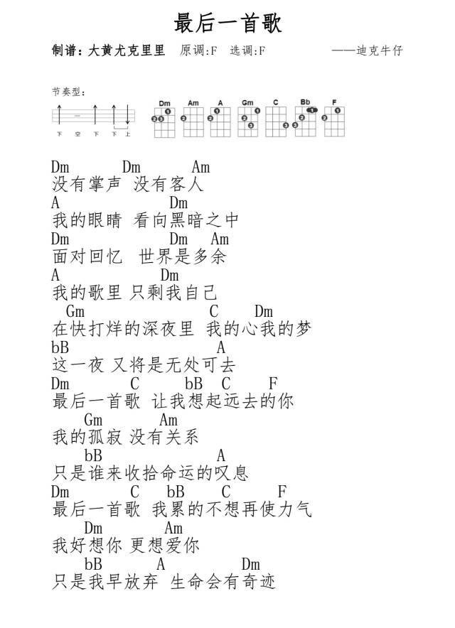 迪克牛仔《最后一首歌》尤克里里谱-F调和弦弹唱谱...