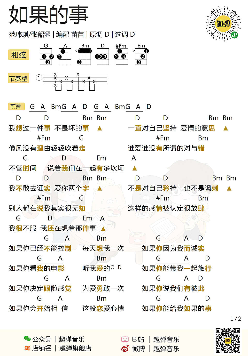 范玮琪·张韶涵《如果的事》尤克里里谱-D调女生弹唱版...