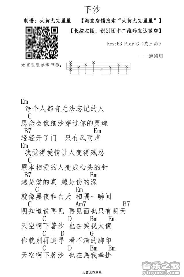 游鸿明《下沙》尤克里里谱_-C调和弦弹唱谱...