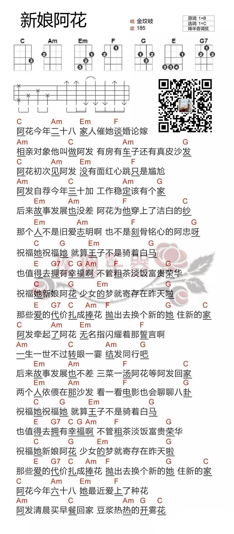金玟岐《新娘阿花》尤克里里谱_C调和弦弹唱谱...