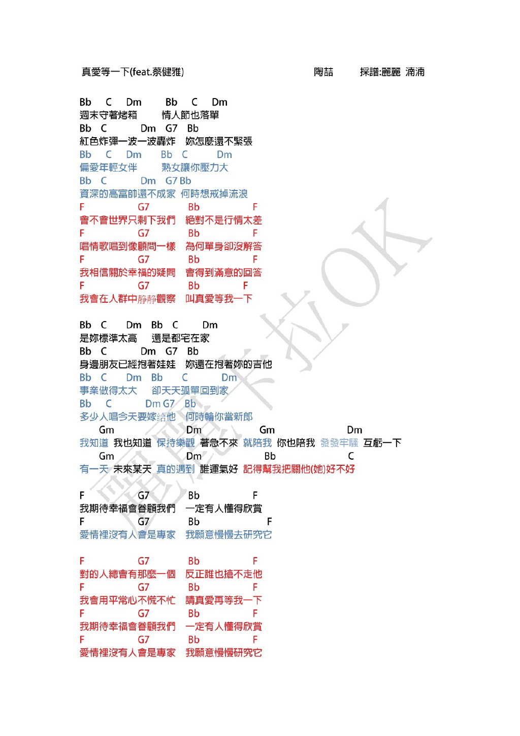 尤克里里蔡健雅&陶喆《真爱等一下》 尤克里里谱-C调弹唱谱