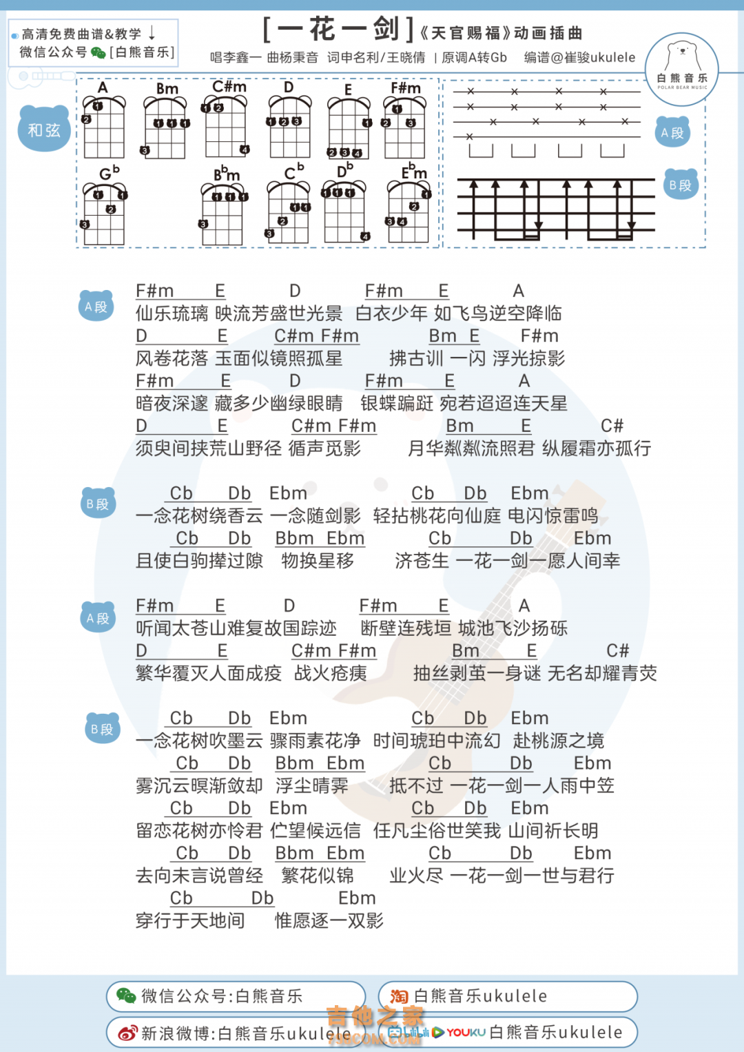 尤克里里动画天官赐福插曲《一花一剑》尤克里里谱-G调弹唱谱