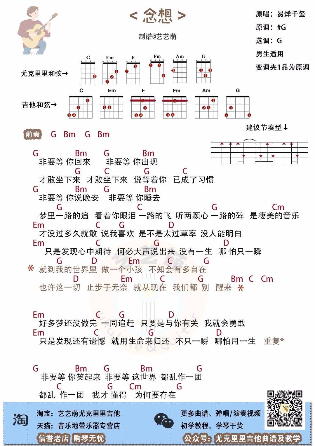 易烊千玺《念想》尤克里里谱...