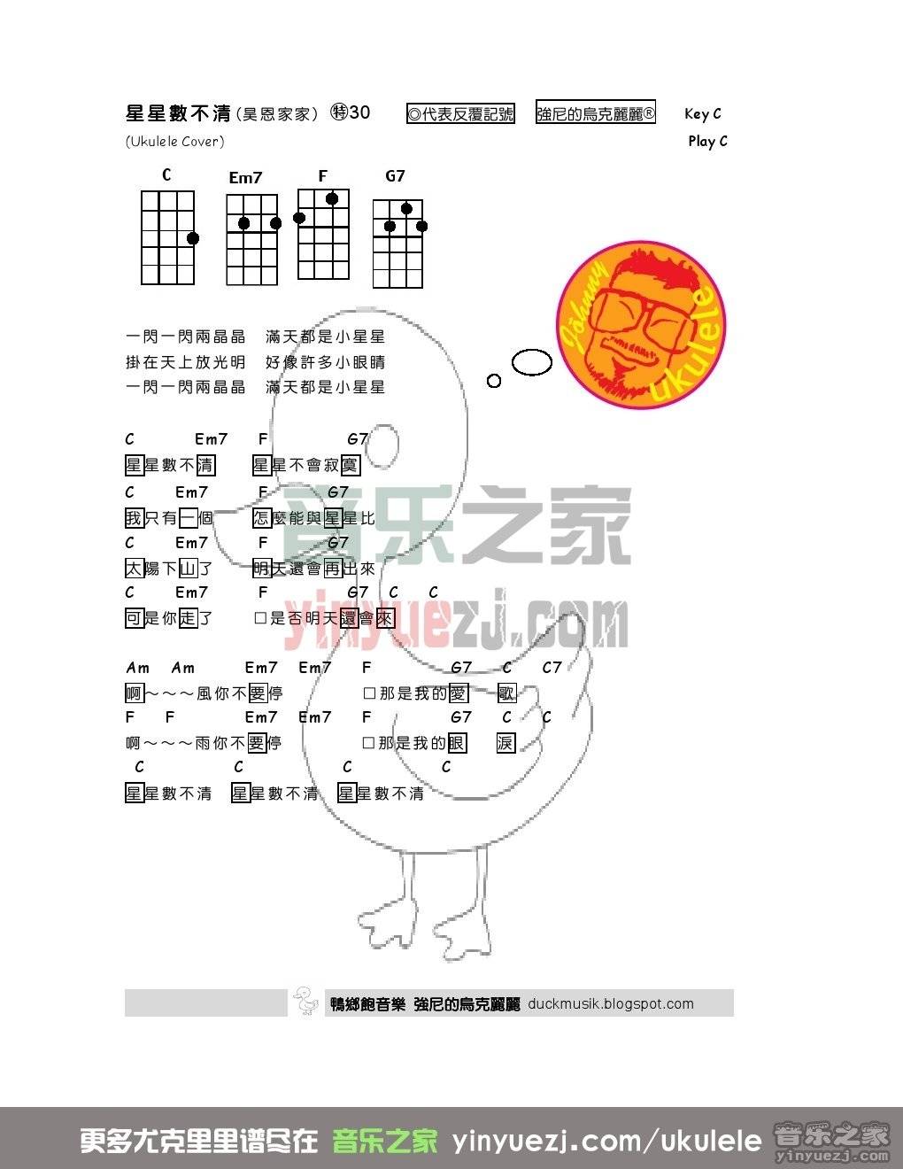 尤克里里 昊恩家家《星星数不清》尤克里里弹唱谱