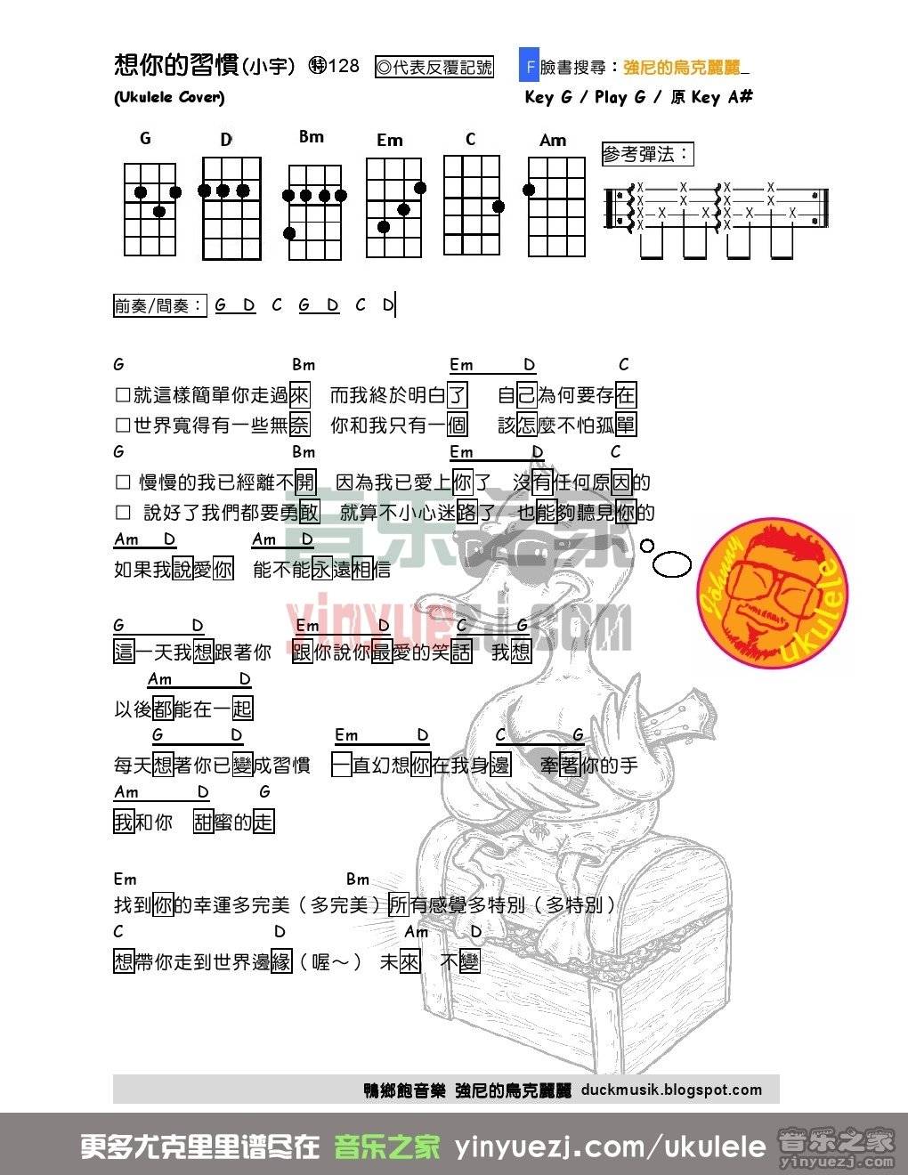 尤克里里 小宇《想你的习惯》尤克里里弹唱谱