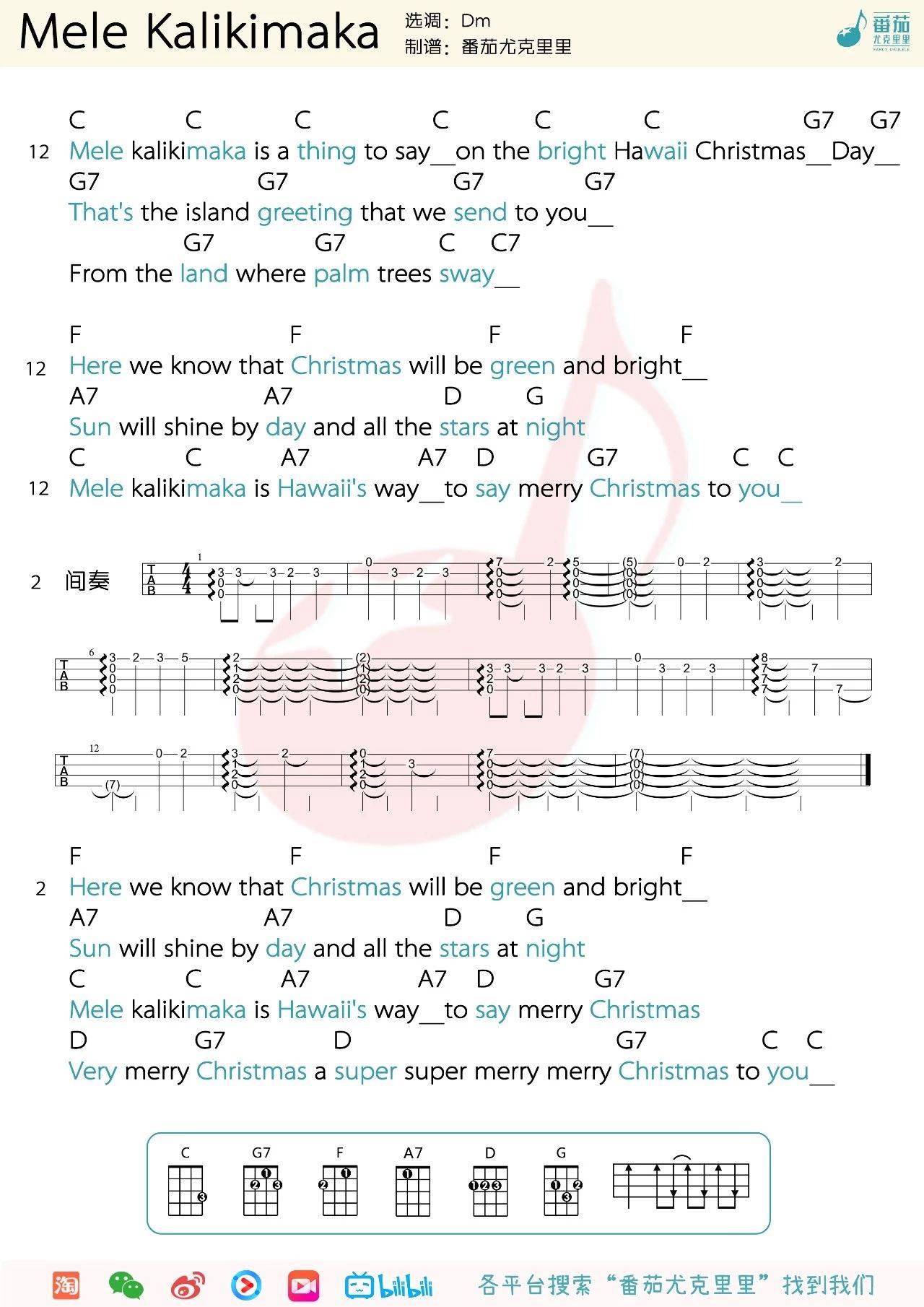 尤克里里圣诞金曲《Mele kalikimaka》尤克里里谱