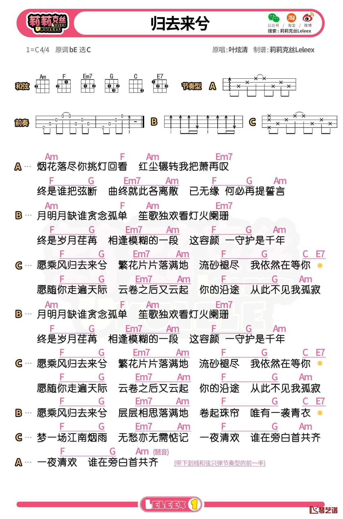叶炫清《归去来兮》尤克里里谱弹唱曲谱...