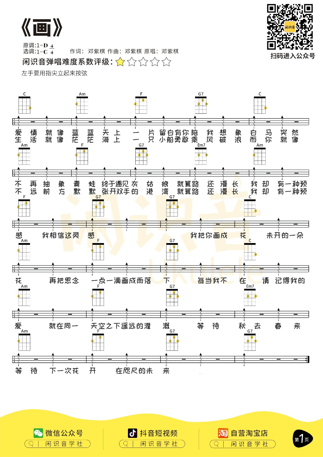 邓紫棋《画》简单版尤克里里弹唱谱C调完整弹唱...