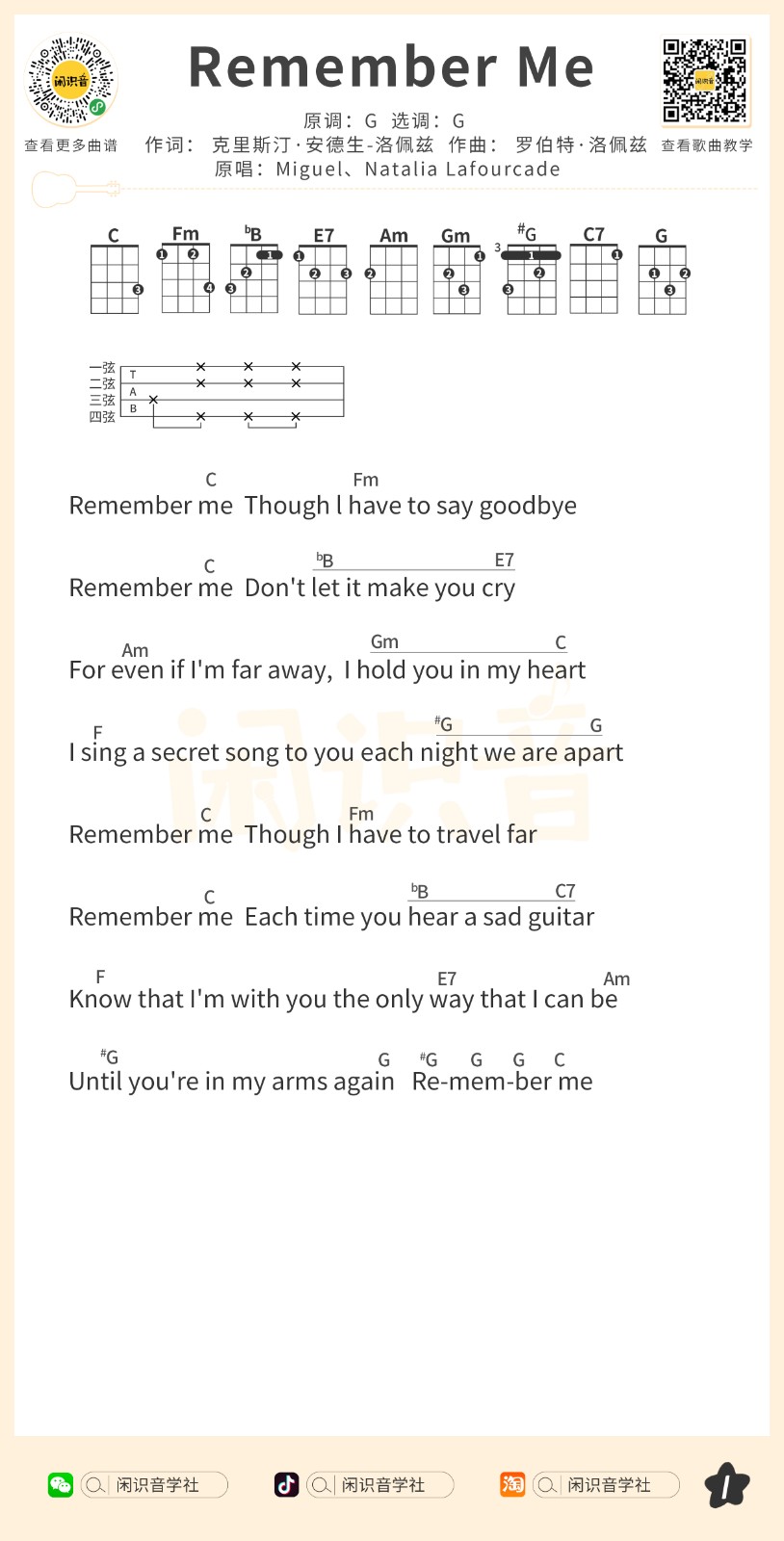 《Rememberme》尤克里里曲谱G调完整弹唱...