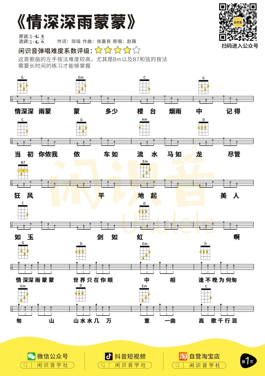 赵薇《情深深雨蒙蒙》尤克里里曲谱-G调完整弹唱...