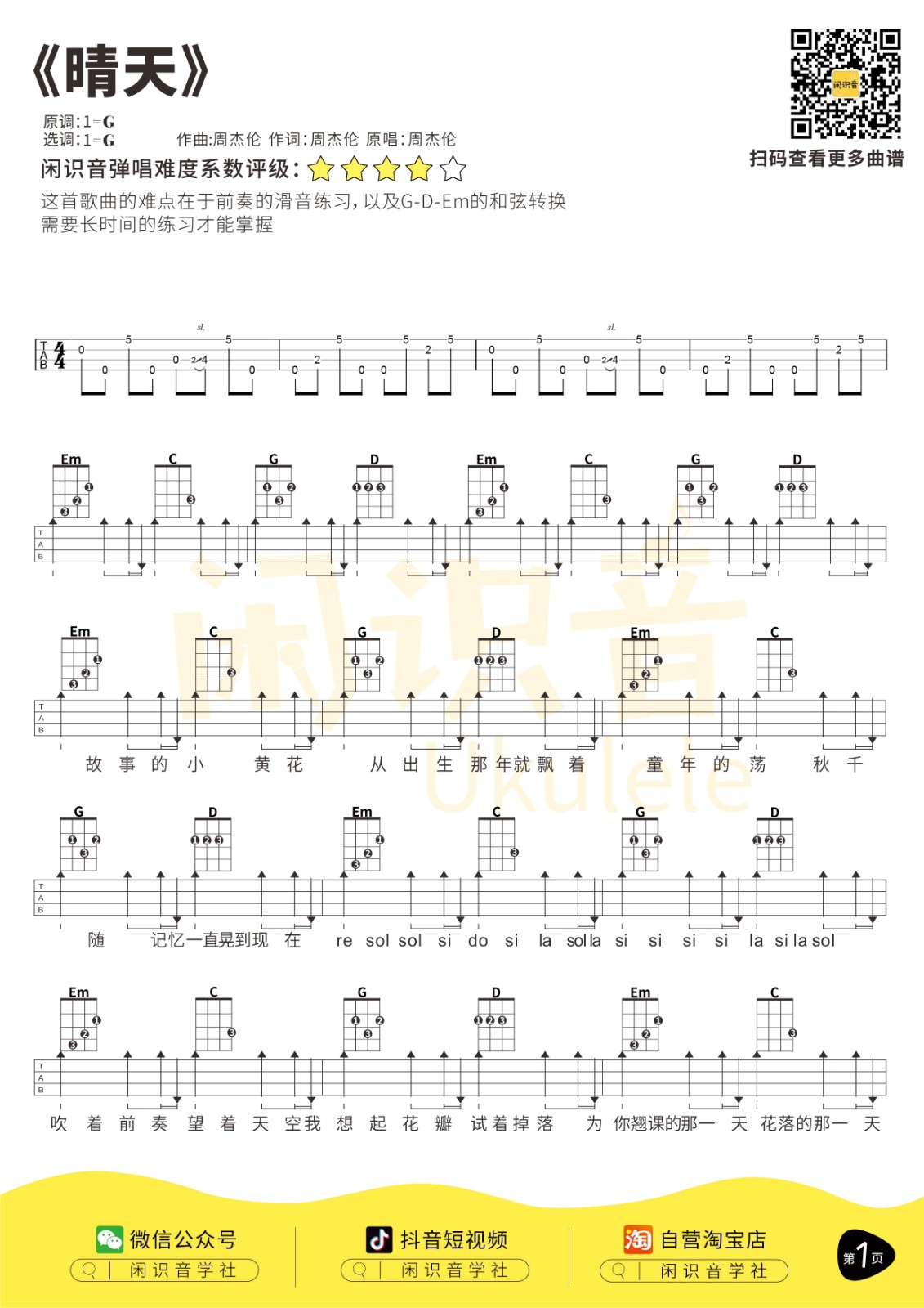 周杰伦《晴天》尤克里里曲谱-G调完整弹唱...