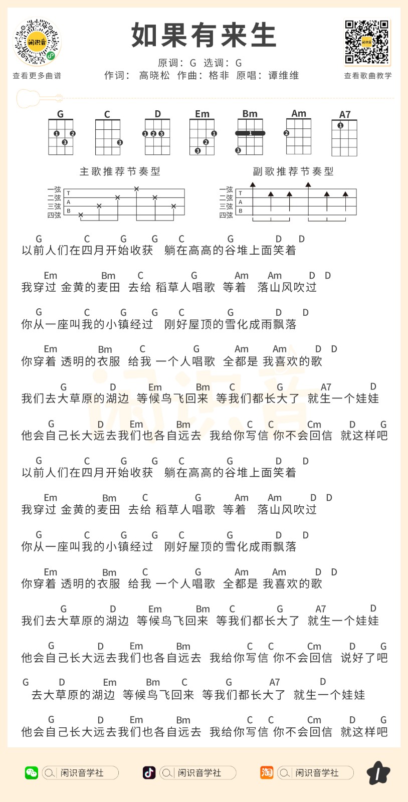 谭维维《如果有来生》尤克里里曲谱-G调完整弹唱...