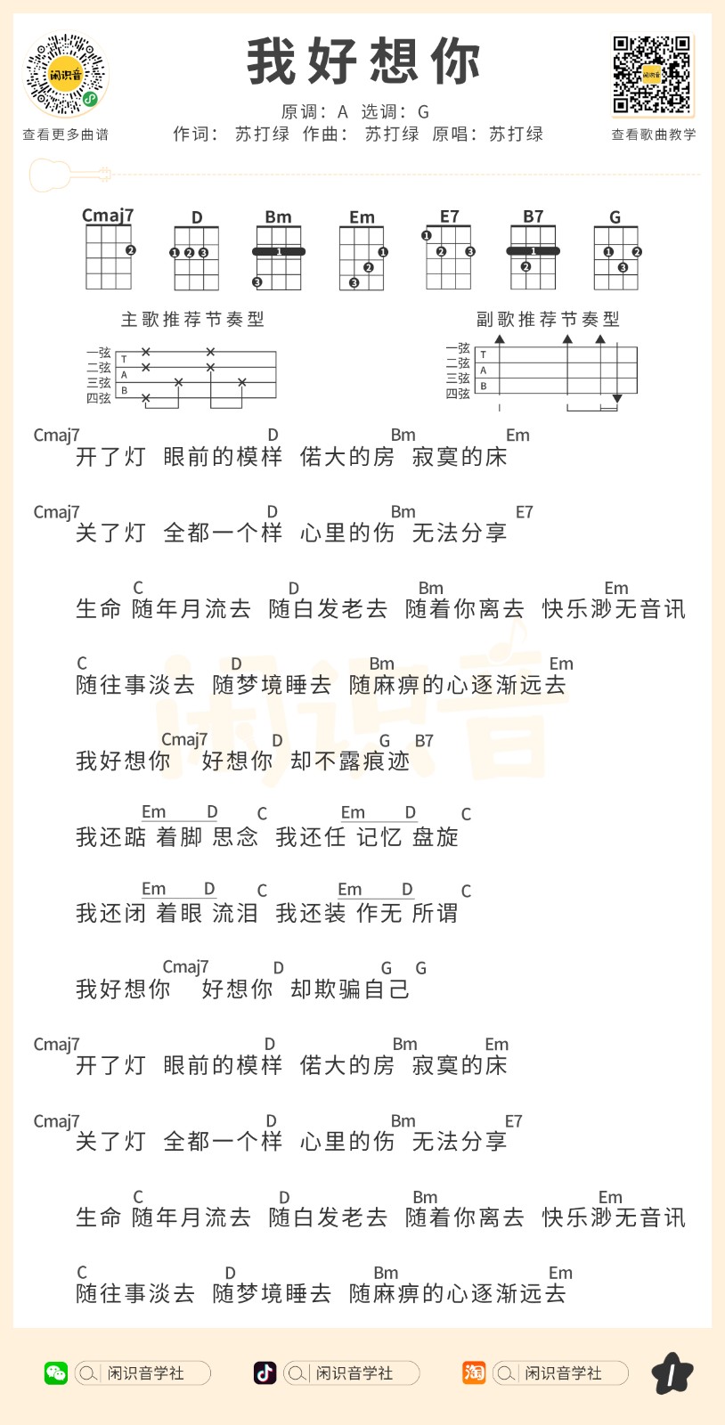 苏打绿《我好想你》尤克里里曲谱G调完整弹唱...