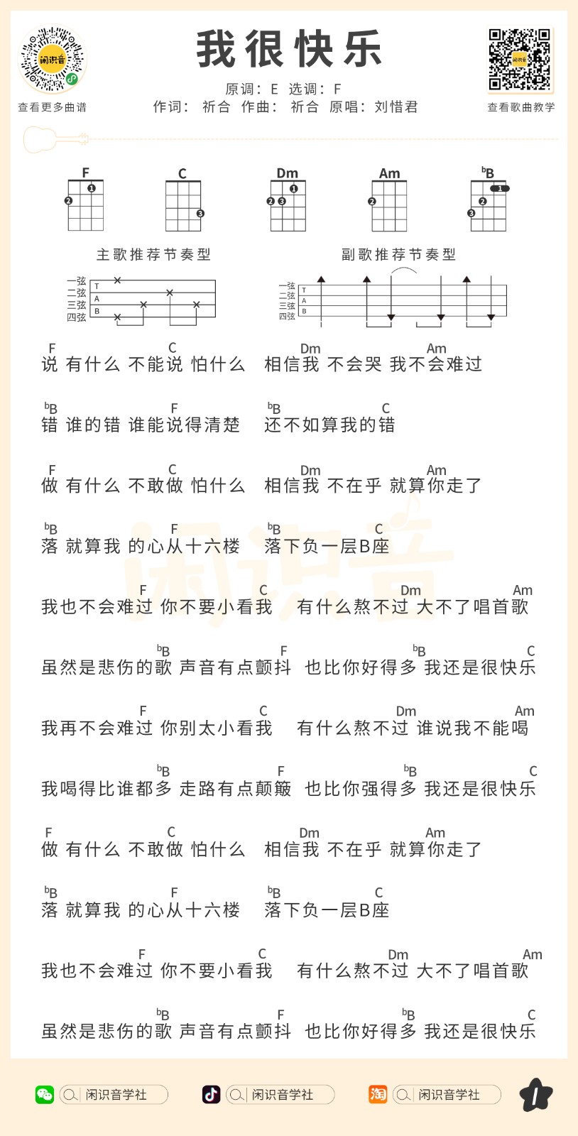 尤克里里刘惜君《我很快乐》尤克里里曲谱F调完整弹唱