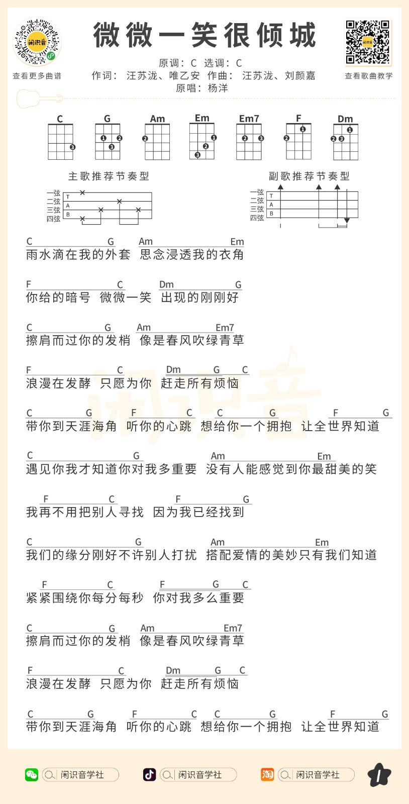 杨洋《微微一笑很倾城》尤克里里曲谱-C调完整弹唱...