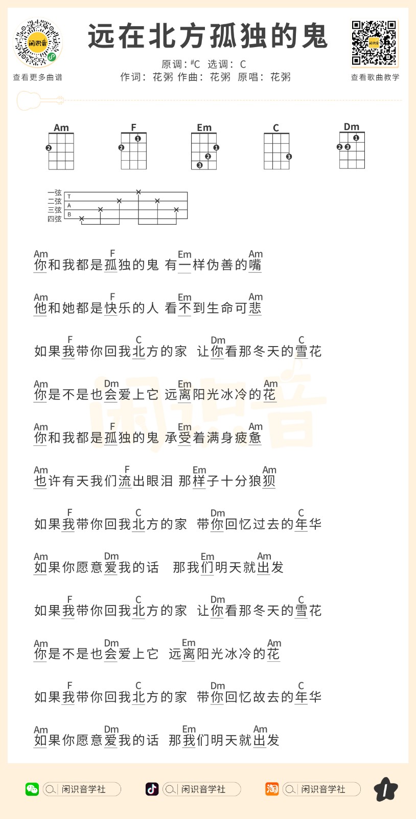 花粥《远在北方孤独的鬼》尤克里里曲谱-C调完整弹唱...