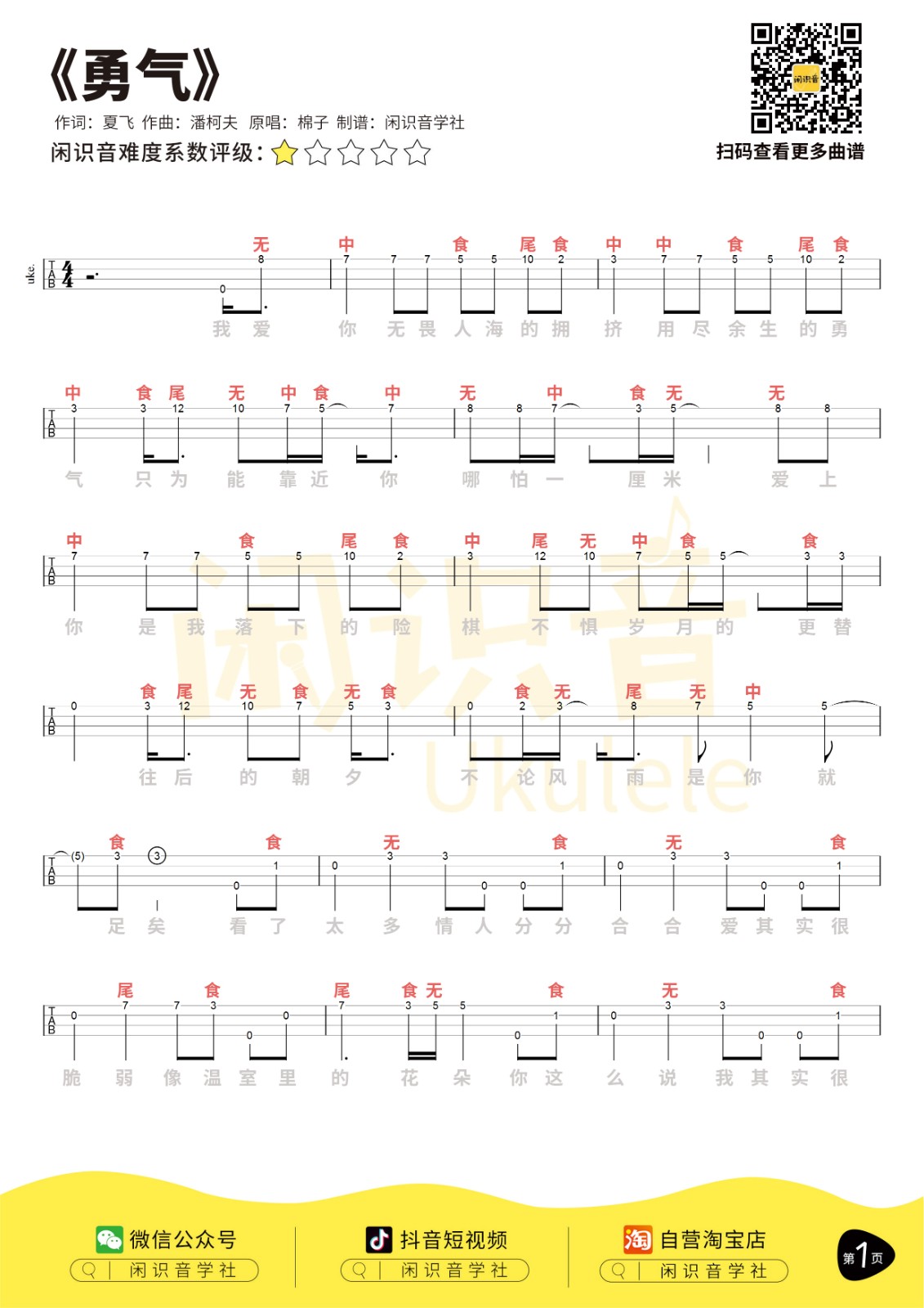 棉子《勇气》尤克里里曲谱-C调完整弹唱...
