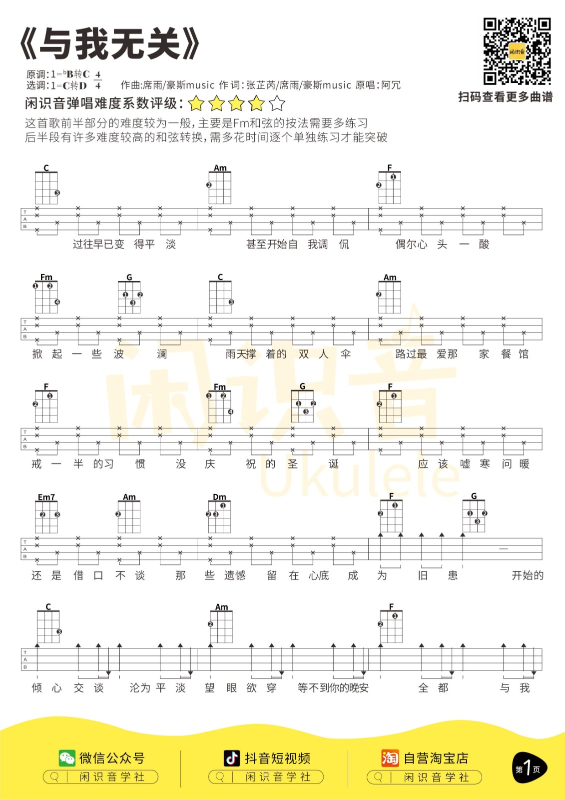 阿冗《与我无关》尤克里里曲谱-C调完整弹唱...