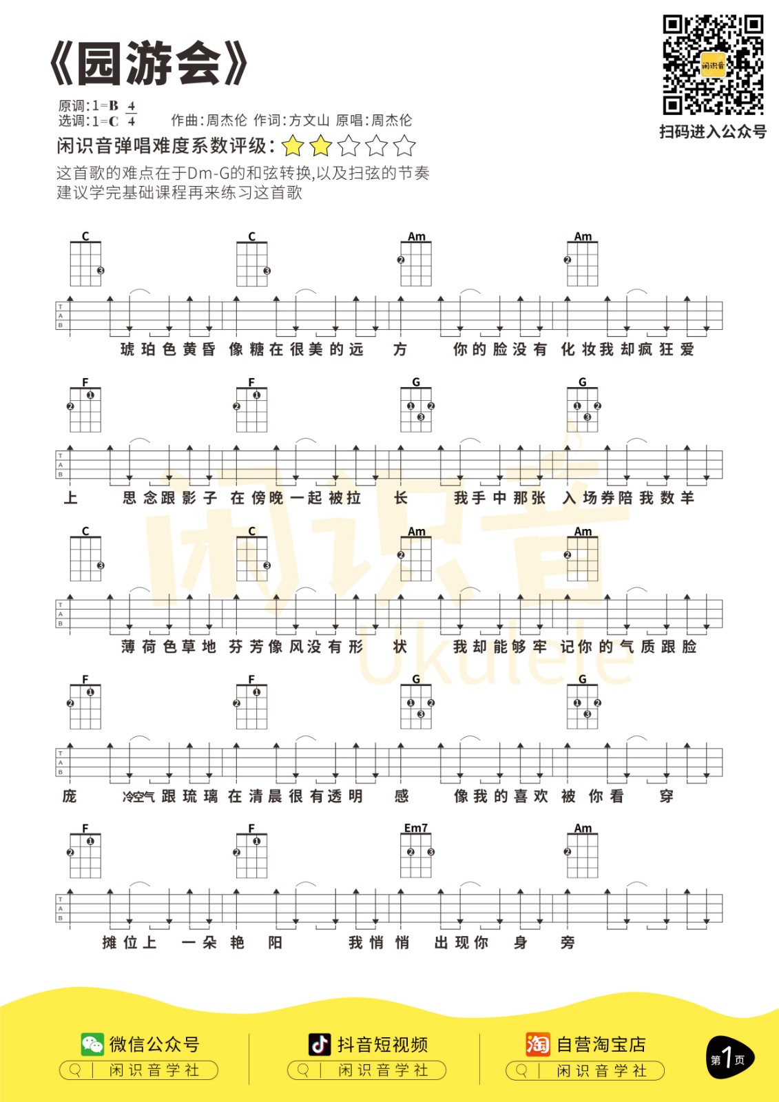尤克里里周杰伦《园游会》尤克里里曲谱-C调完整弹唱