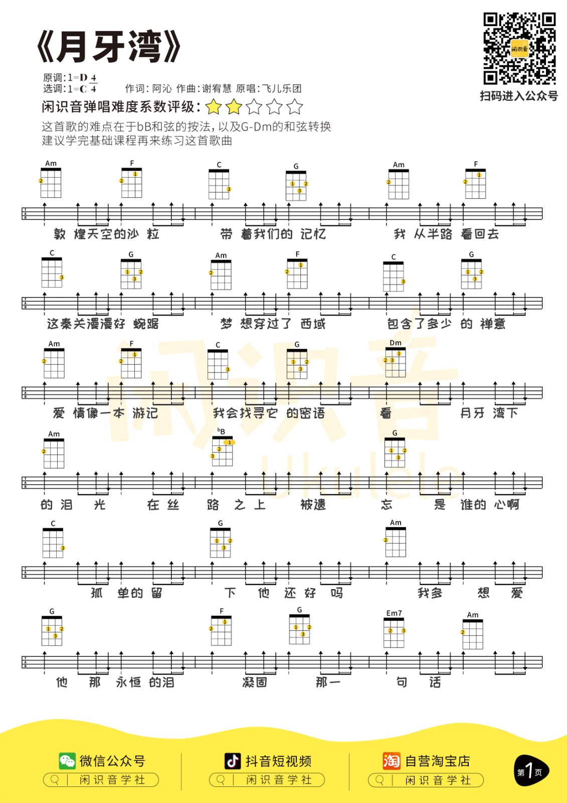 飞儿乐队《月牙湾》尤克里里曲谱-C调完整弹唱...