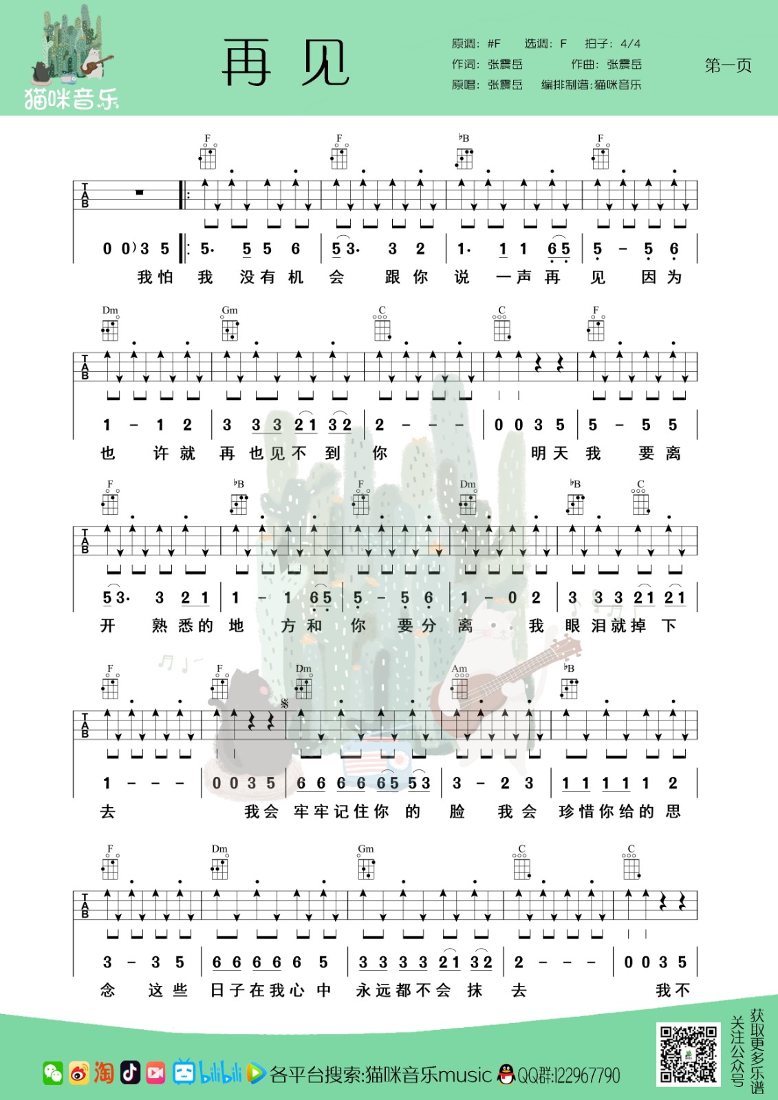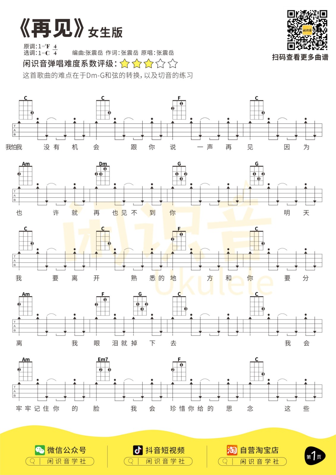 张震岳《再见》男生版/女生版尤克里里曲谱-C调完整弹唱...