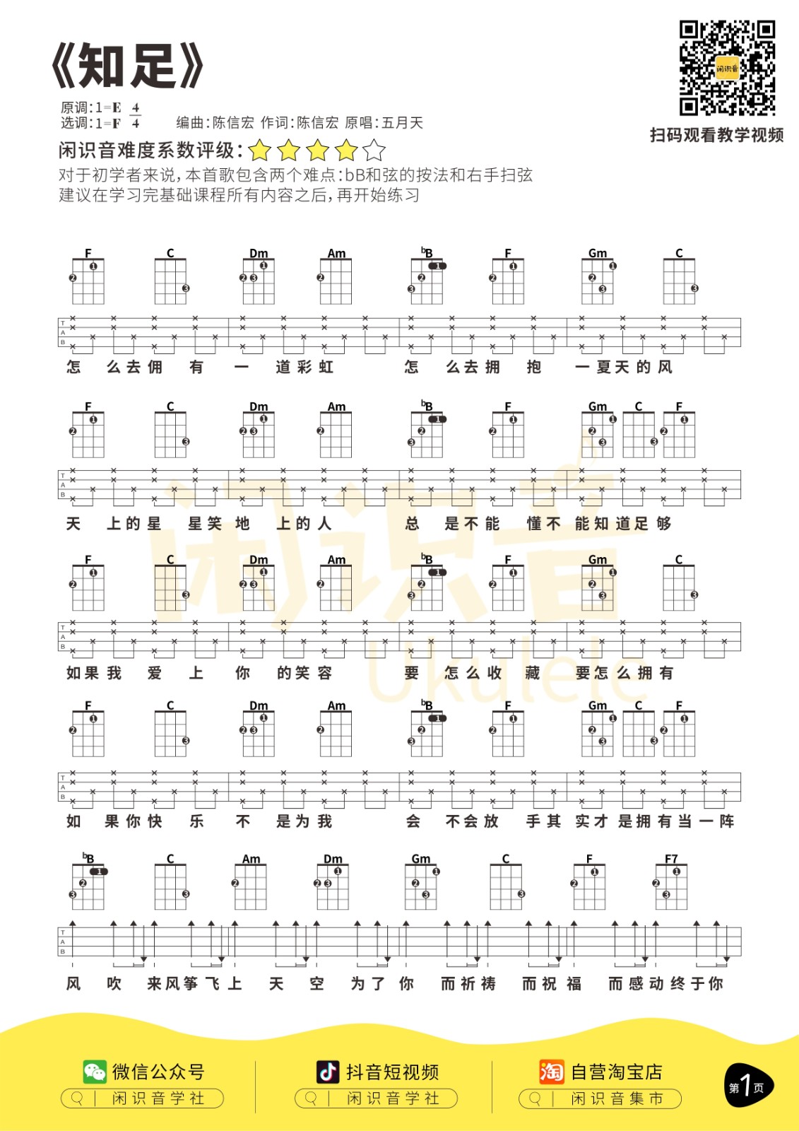 尤克里里五月天《知足》尤克里里谱- F调完整弹唱