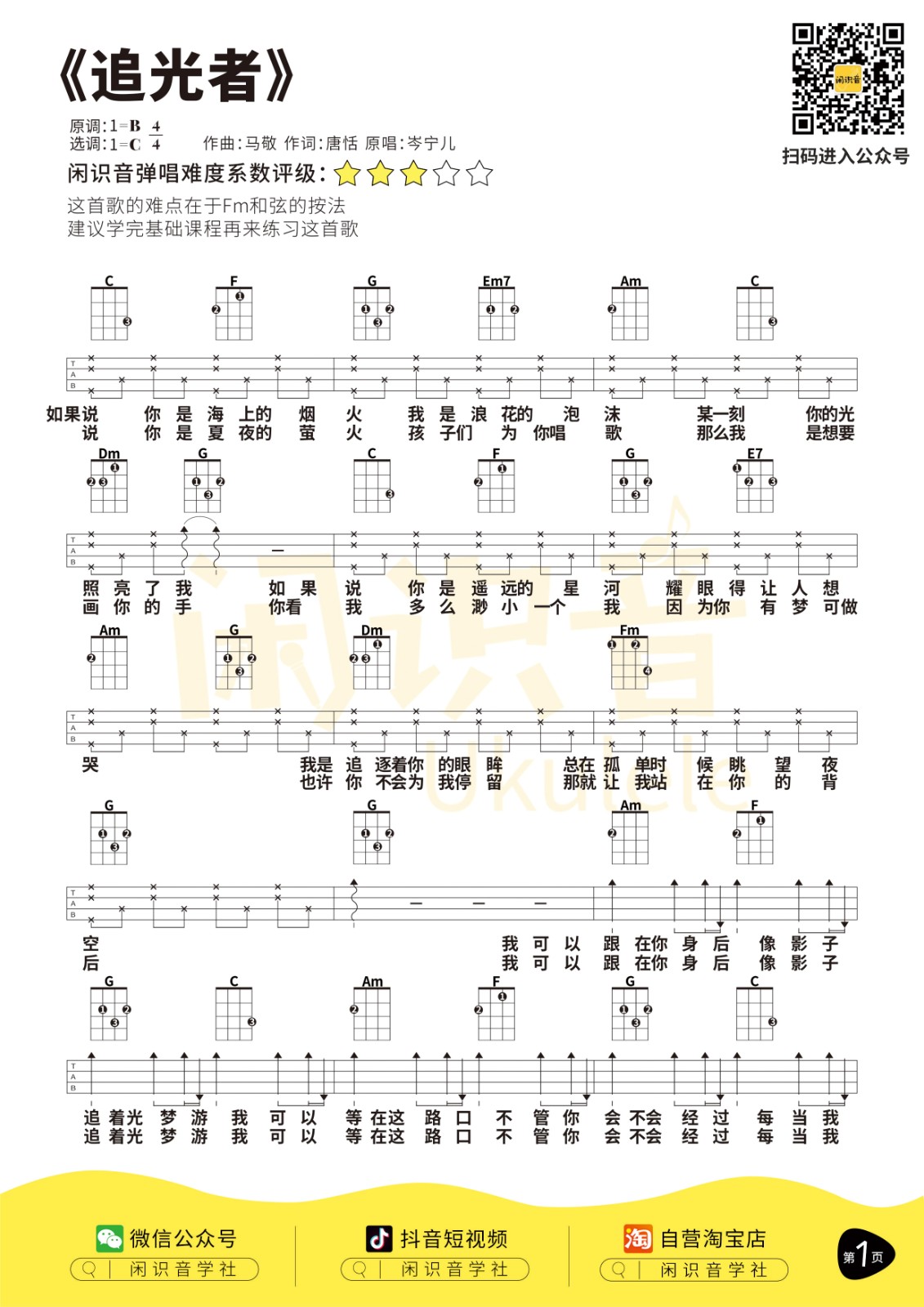 岑宁儿《追光者》C调尤克里里谱完整弹唱...