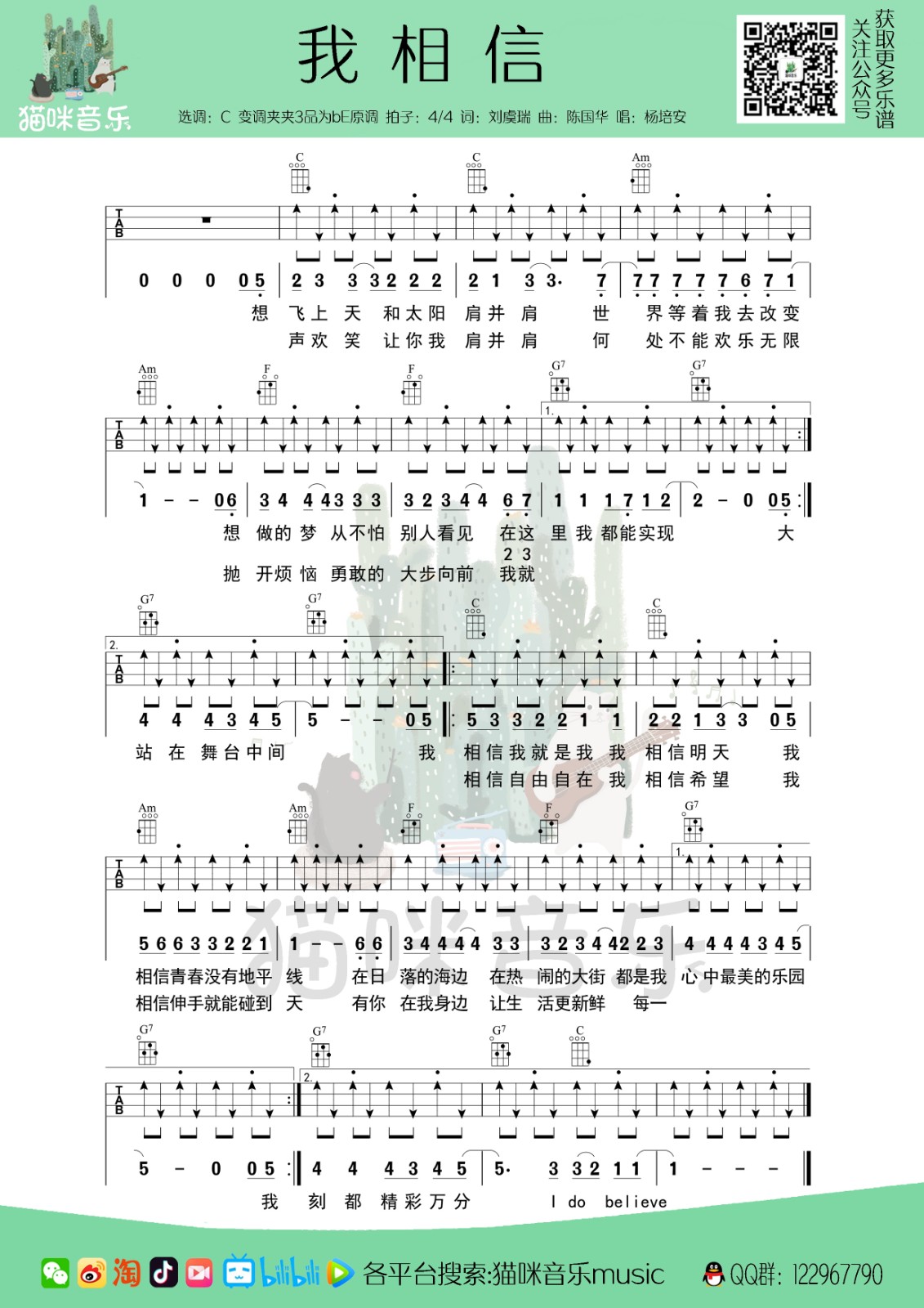 杨培安《我相信》C调尤克里里谱完整弹唱...