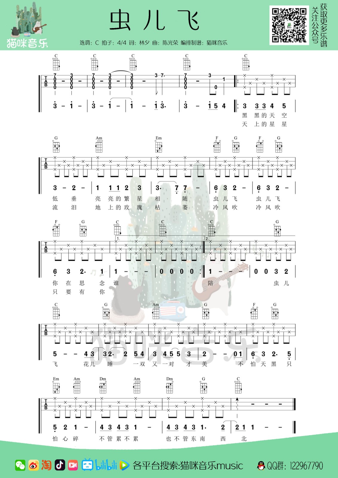 《虫儿飞》C调尤克里里谱完整弹唱...