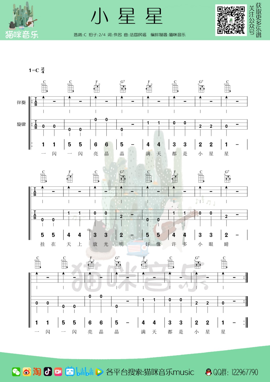 儿歌《小星星》尤克里里谱-C调完整弹唱...