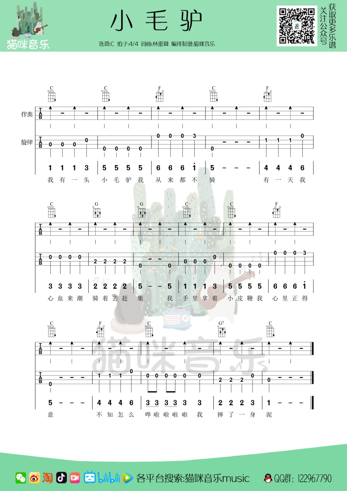 儿歌《小毛驴》尤克里里谱-C调完整弹唱...