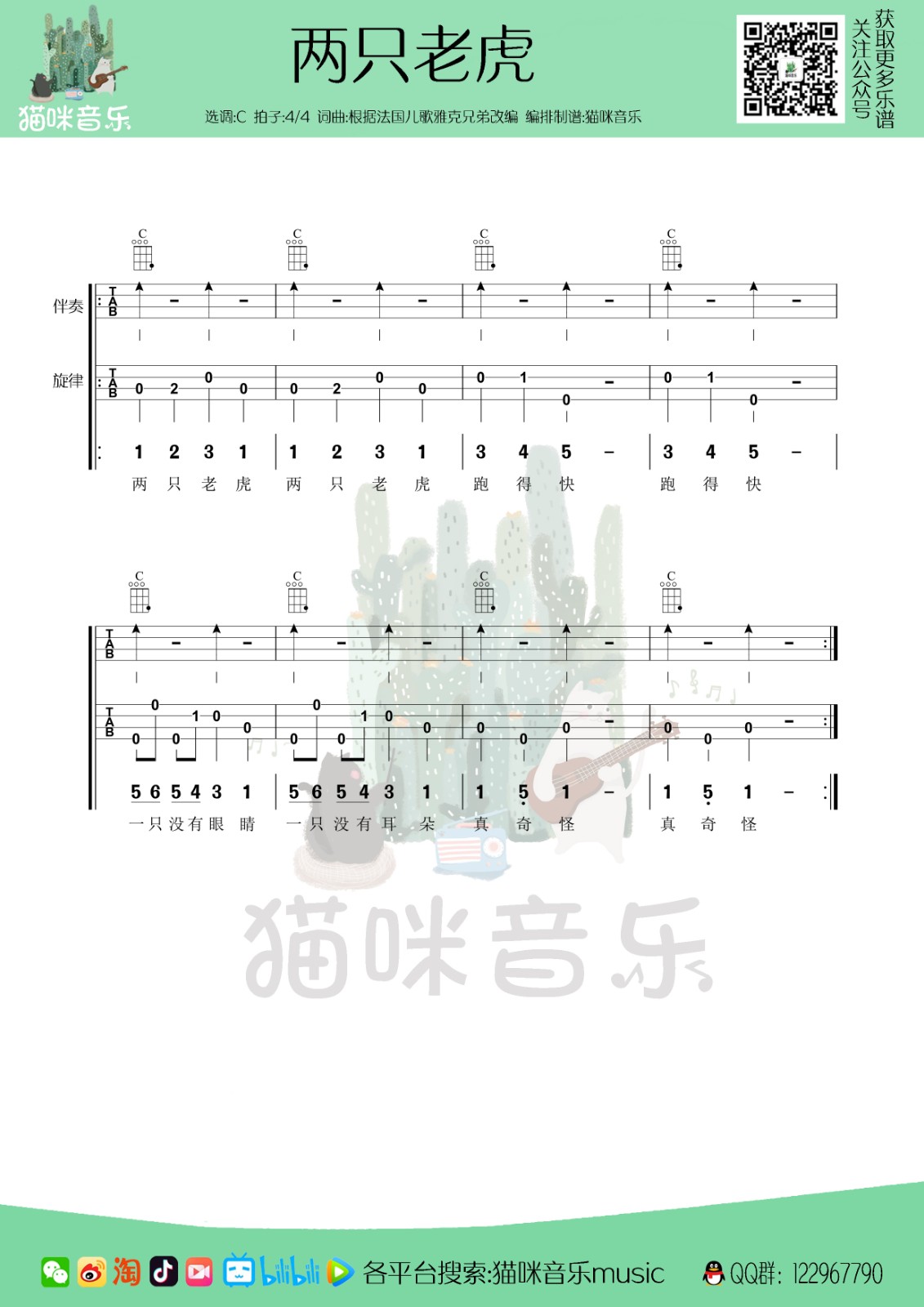 儿歌《两只老虎》尤克里里谱-C调完整弹唱指弹谱...