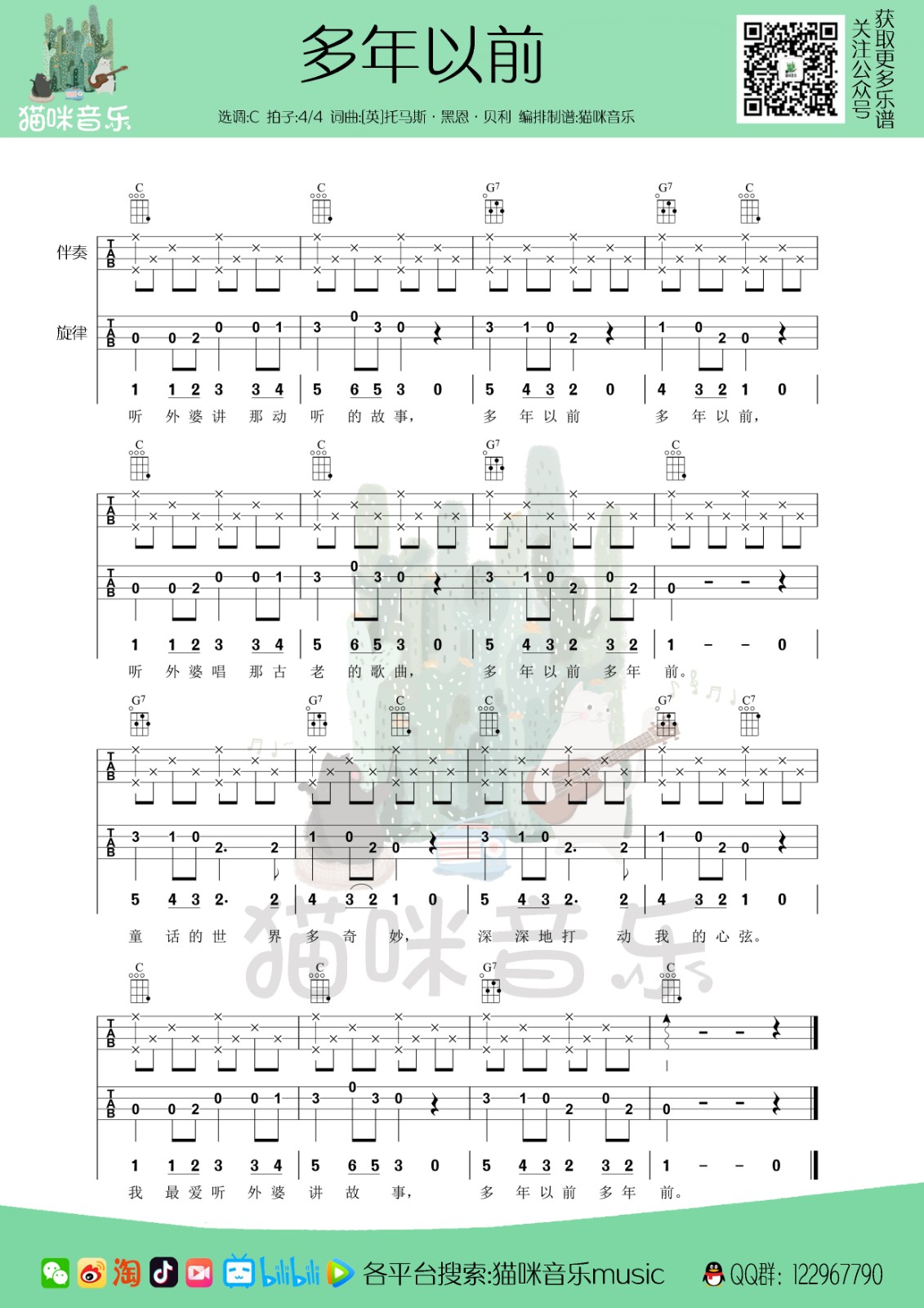 儿歌《多年以前》尤克里里谱-C调完整弹唱指弹谱...