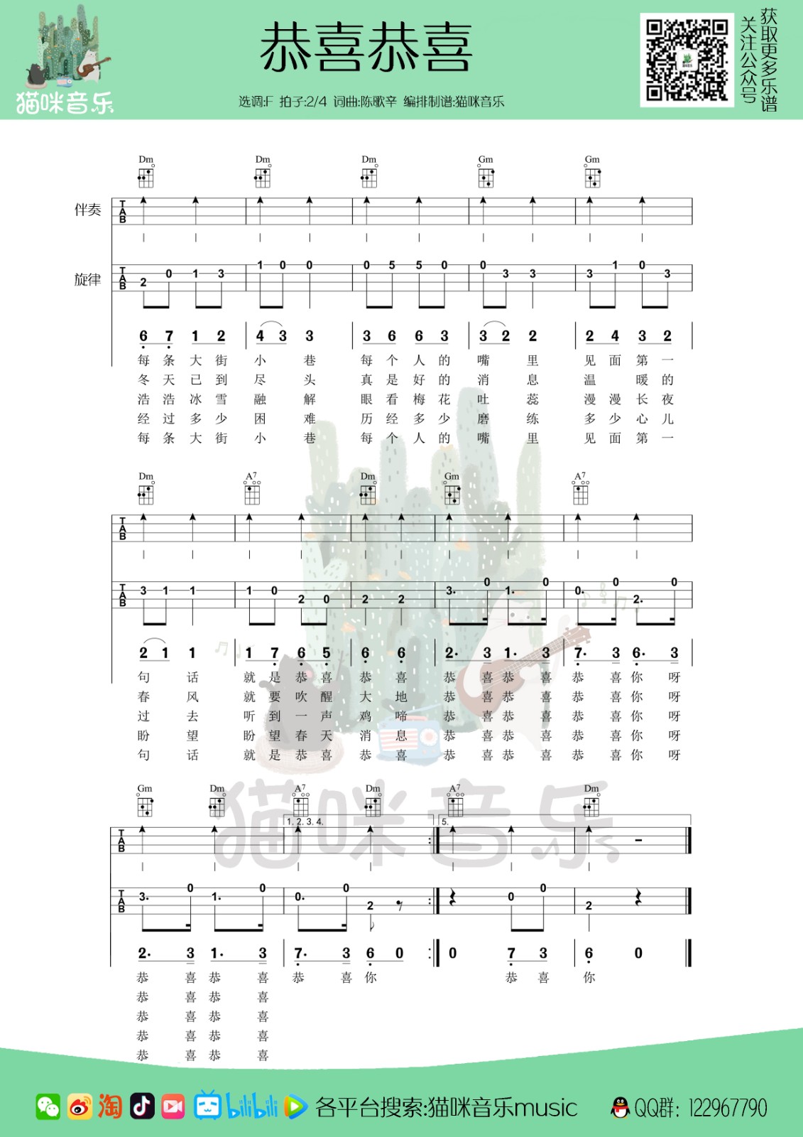 尤克里里儿歌《恭喜恭喜》尤克里里谱-完整弹唱指弹谱